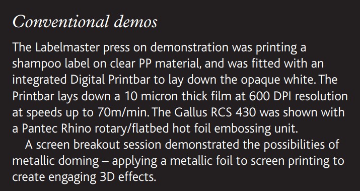 The Labelfire demonstration also allowed Gallus to show off the capabilities of the Labelfire’s in-line Digital Embellishment Unit (DEU). The DEU jets at 600 DPI resolution using Ricoh inkjet heads and is a joint development with Swiss company Steinemann Technology and Schmid Rhyner. It can print variable spot matte and gloss varnishes and cold foil adhesives as well as creating a range of haptic effects. The demonstration wine label job showed simulated embossing combined with digital cold foil metallic effects.